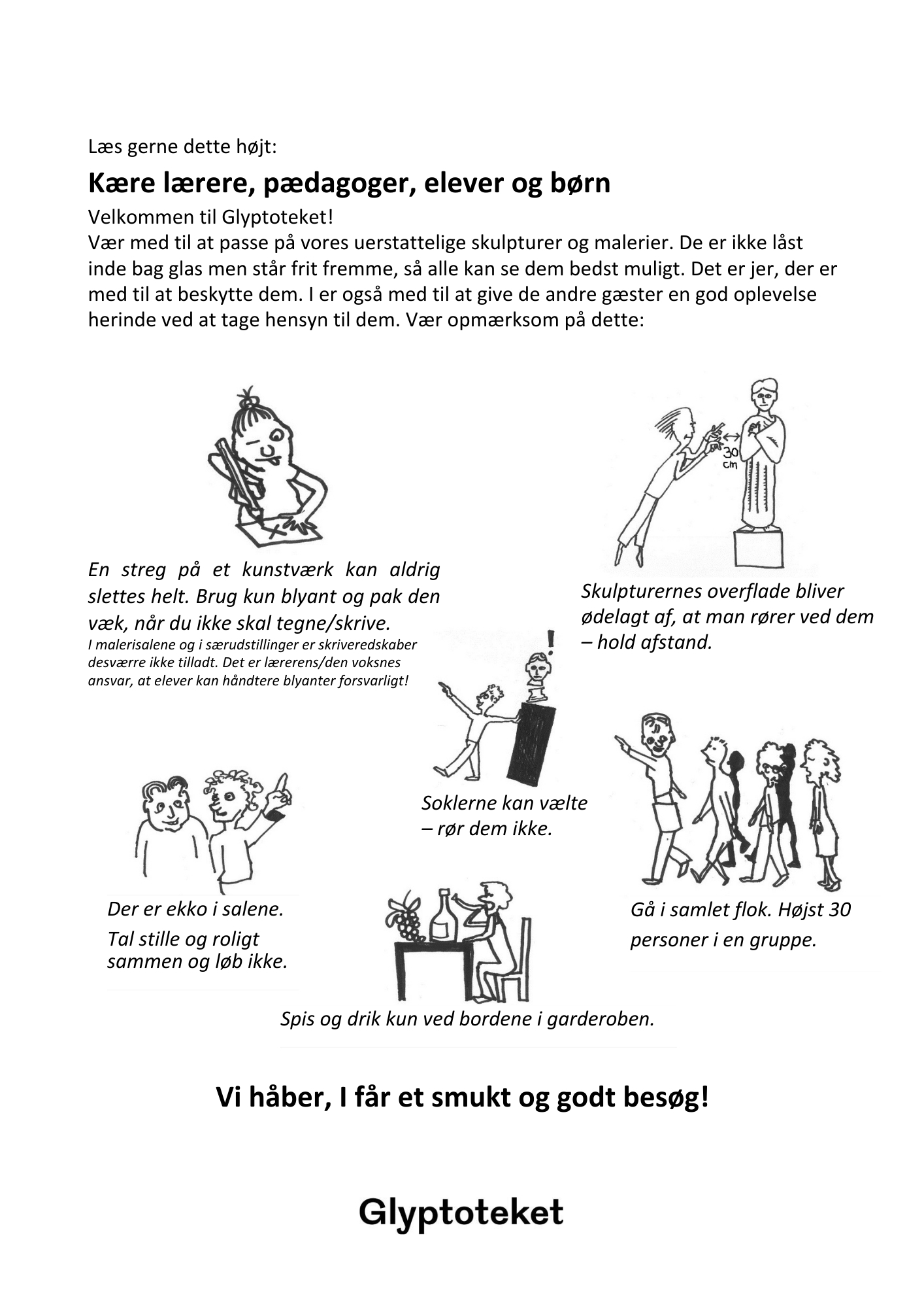 Et besøg på Glyptoteket er en stor oplevelse. Som lærer eller pædagog skal du dog være opmærksom på, at de fleste kunstværker på Glyptoteket står frit og let kan beskadiges ved berøring.